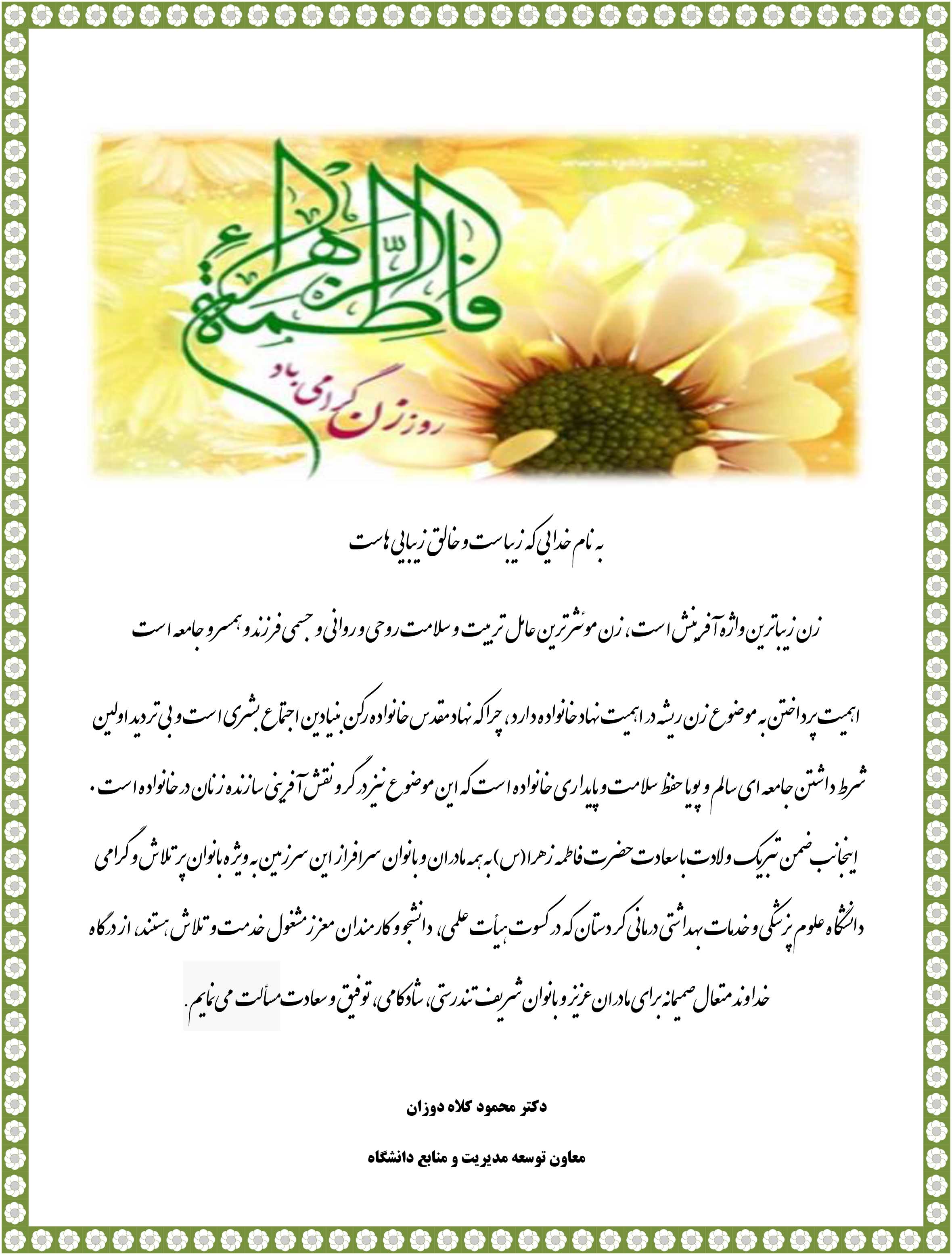 دکتر محمود کلاه دوزان معاون توسعه مدیریت و منابع دانشگاه در پیامی ولادت حضرت فاطمه زهرا (س) و روز مادر را  تبریک گفت :